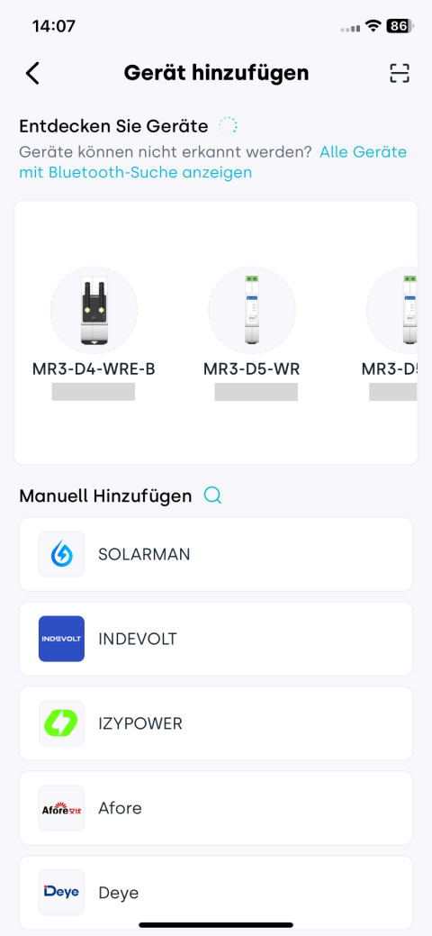Die Bluetooth-Suche unterstützt derzeit SOLARMAN-, INDEVOLT- und IZYPOWER-Geräte. Tippen Sie in der App auf Geräte anzeigen, die Bluetooth-Suche unterstützen, um weitere Details zu erhalten.