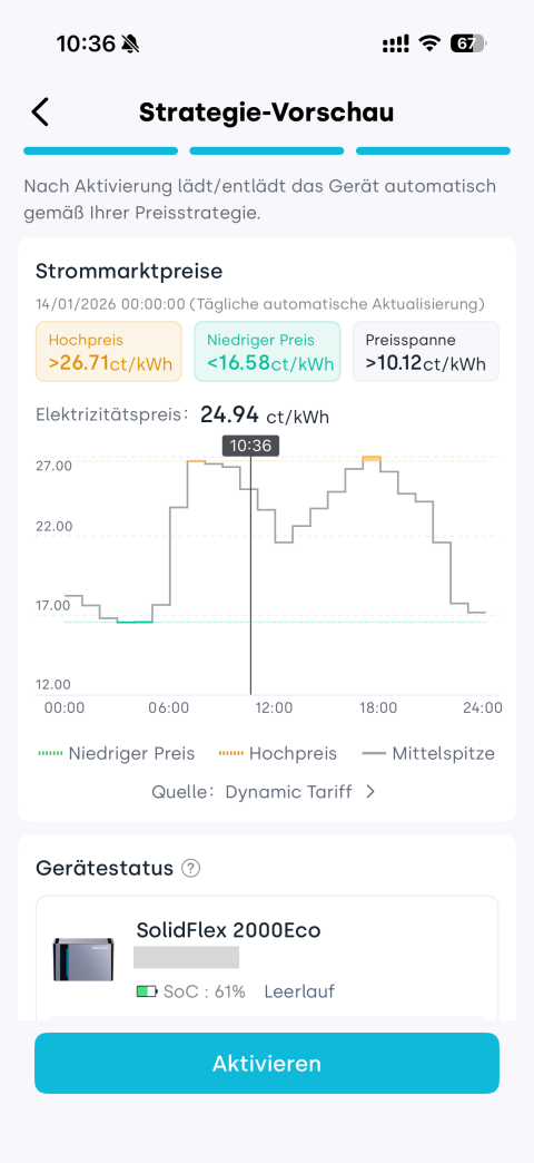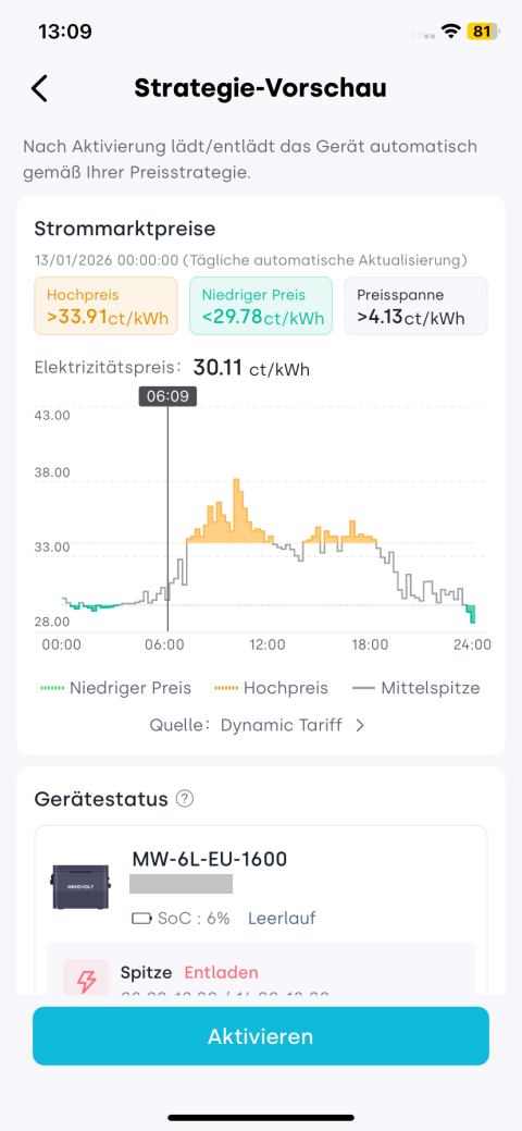 Prüfen Sie den vom System erzeugten Lade-/Entladeplan. Tippen Sie auf Aktivieren, um die Strategie zu aktivieren.