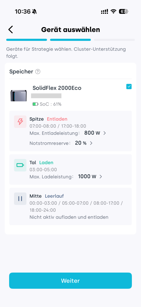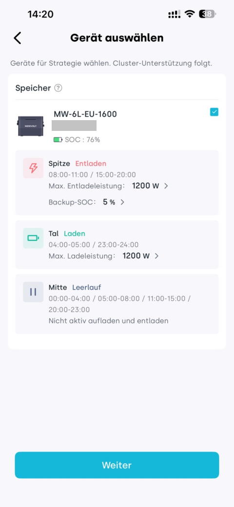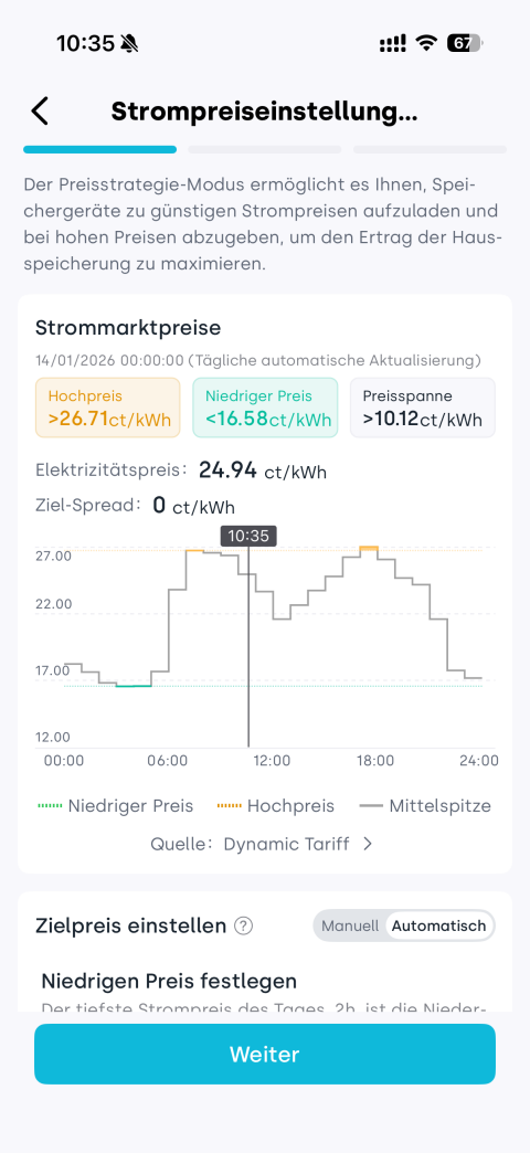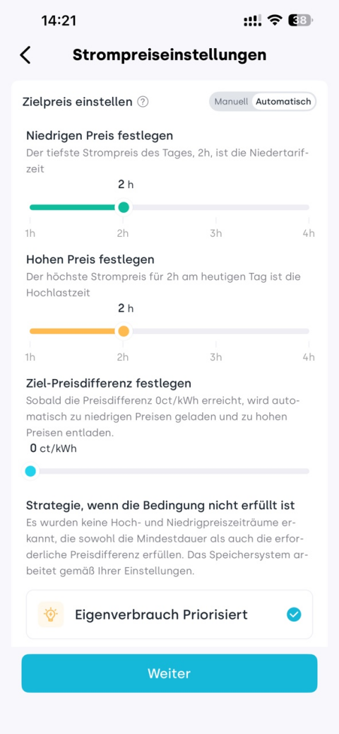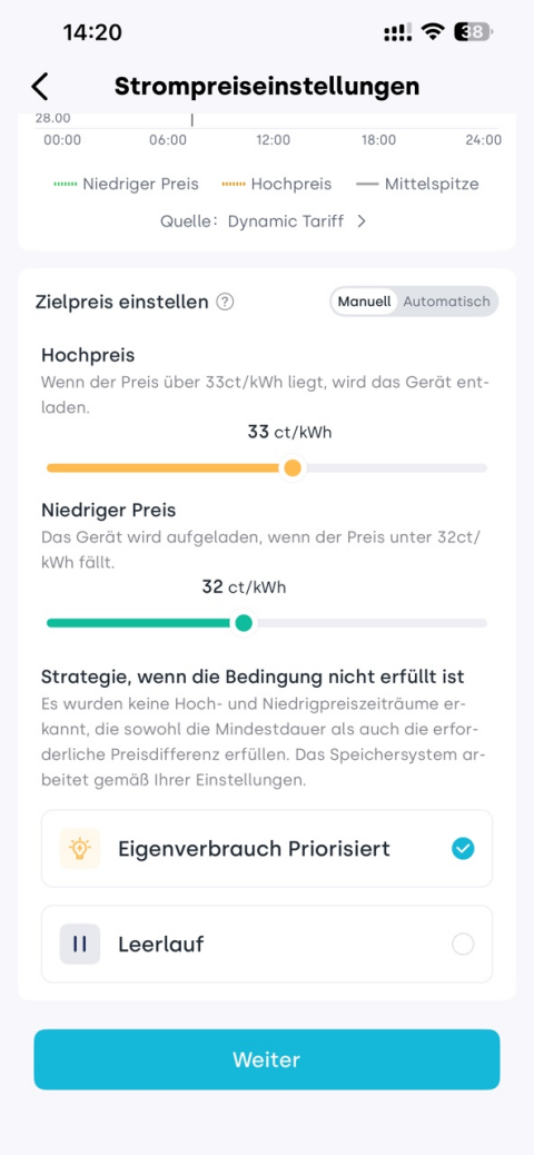 Legen Sie den Zielpreis einstellen (manuell/automatisch) fest, der das Lade- und Entladeverhalten auslöst, sowie die Strategie, wenn die Bedingung nicht erfüllt ist (Eigenverbrauch Priorisiert / Leerlauf). Tippen Sie auf Weiter.