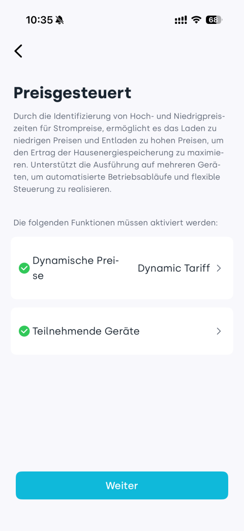 Folgen Sie den Hinweisen und stellen Sie sicher, dass Sie bereits einen Stromtarif konfiguriert und geeignete Geräte für die Strategie im Haushalt hinzugefügt haben. Falls nicht, tippen Sie auf die entsprechenden Bereiche und schließen Sie die Einrichtung ab. Tippen Sie danach auf Weiter, um fortzufahren.