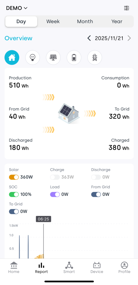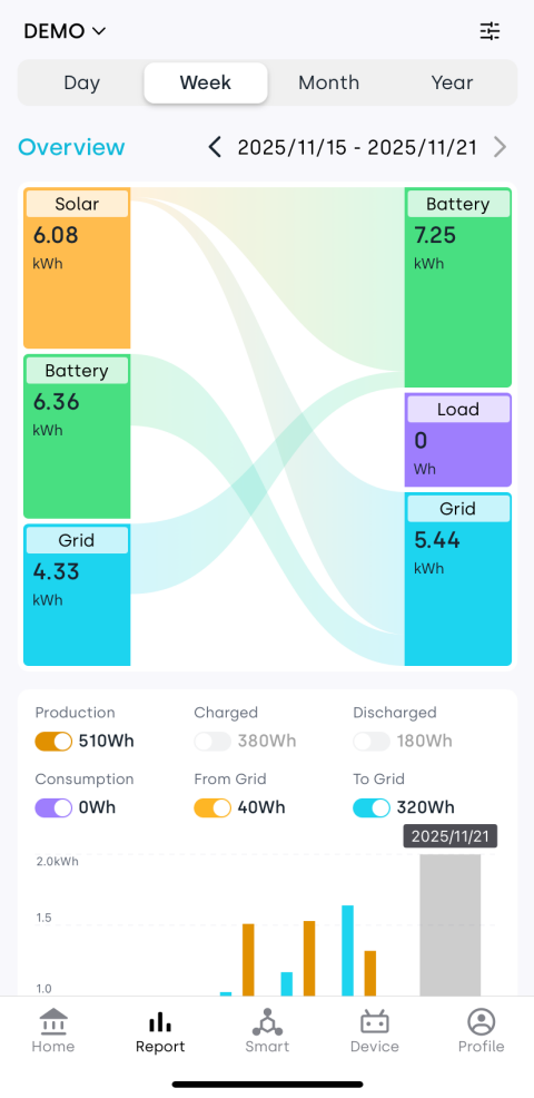 The Report page provides a comprehensive analysis of your home’s energy data, supporting four time dimensions: Day, Week, Month, and Year. You can switch between dimensions via the tabs at the top and adjust the time period. The page will dynamically display data for the selected period.
