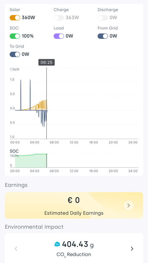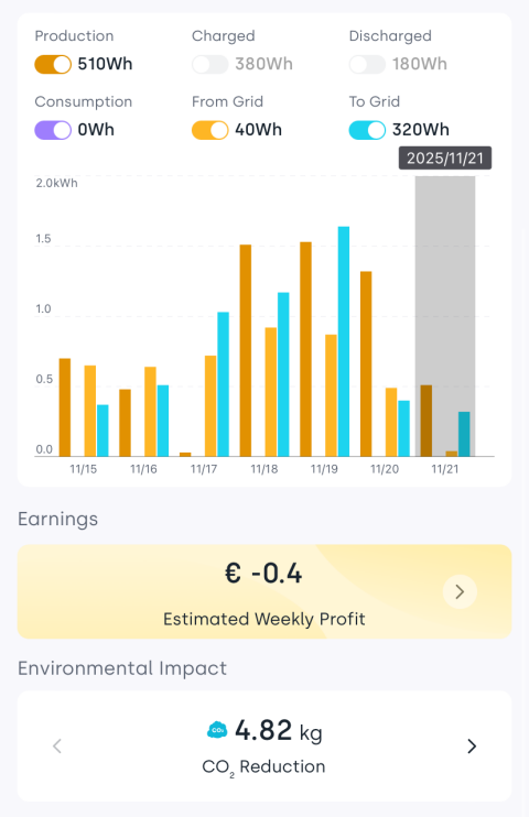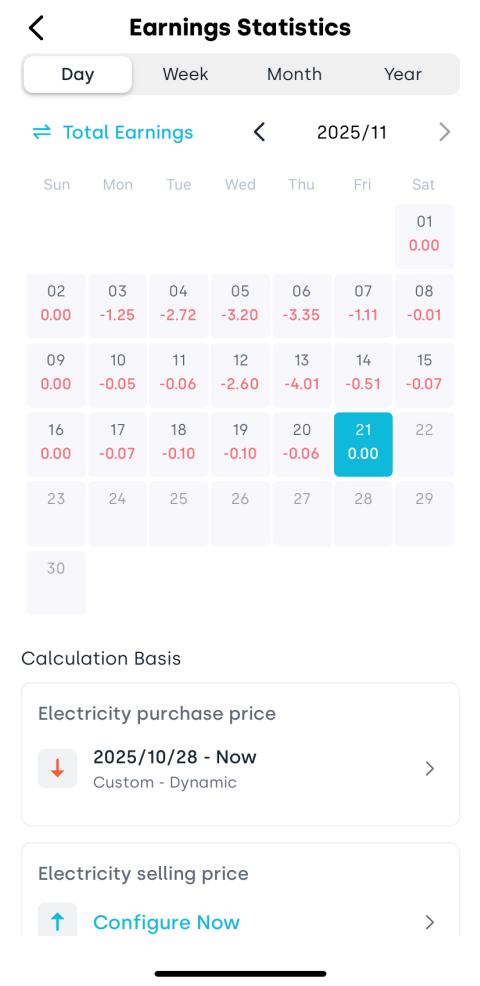 Earnings consist of two parts: self-consumption savings and sales earnings, calculated based on the tariff plan configured for your home.