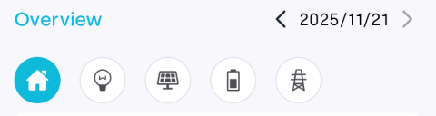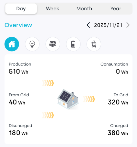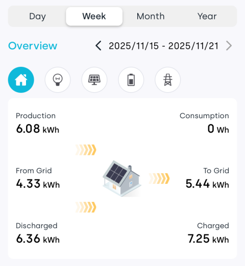 Each time dimension provides an Overview along with detailed views for Consumption, PV, Battery, and Grid. Tap the corresponding icons to switch between data views.