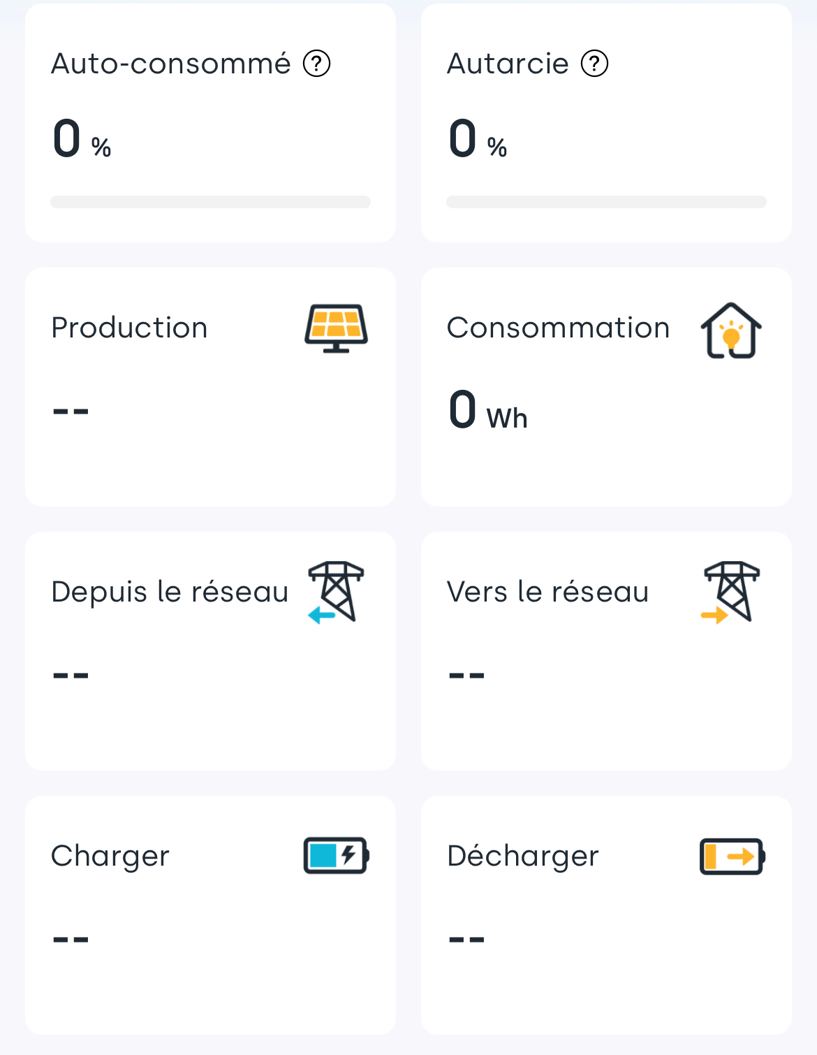 | Autarcie | (Charge provenant du PV + Charge provenant de la batterie) / Consommation totale – montre quelle part de l’électricité de votre domicile provient de votre propre énergie. |