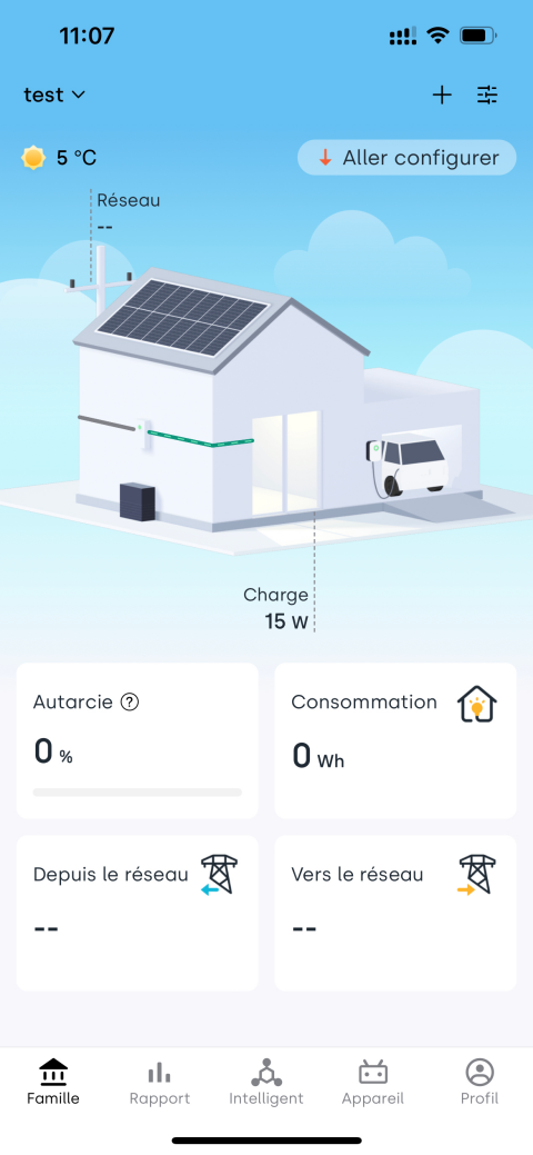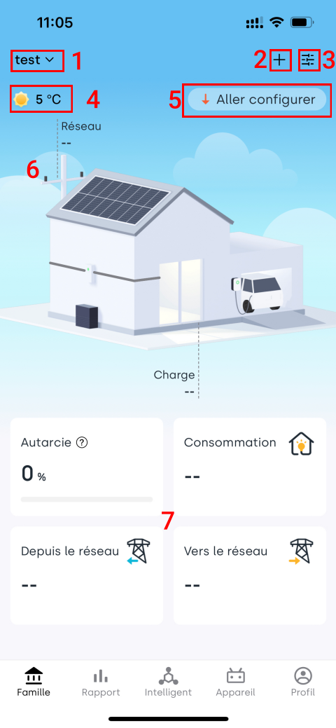 La page Accueil sert d’interface principale pour gérer les données énergétiques de votre domicile actuel. Elle fournit un aperçu de la production, de la consommation et du flux global d’énergie en temps réel.