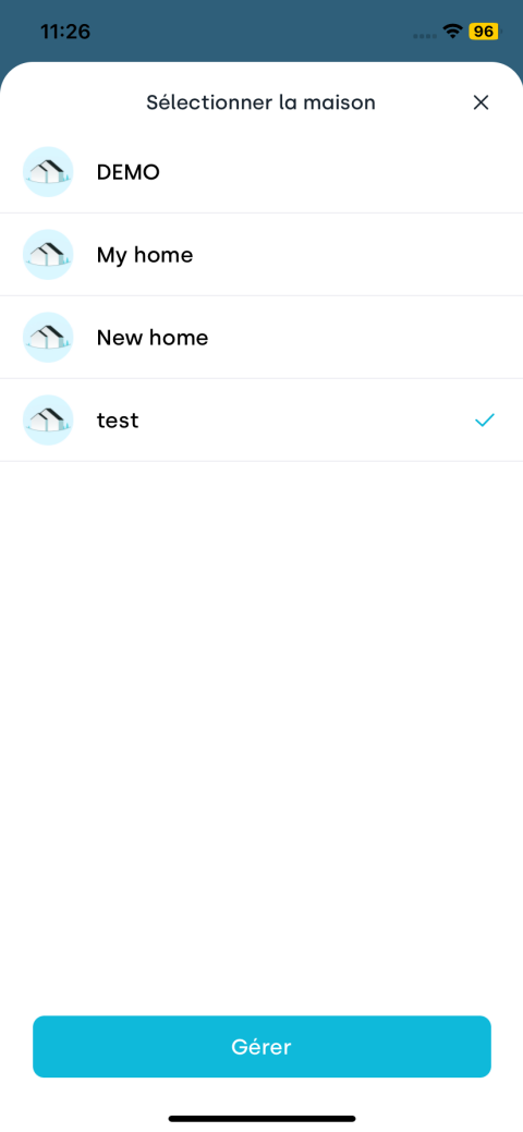 | 1 | test | Affiche le nom de la maison actuelle. Appuyez pour voir, changer de maison ou gérer toutes les maisons liées à votre compte. |