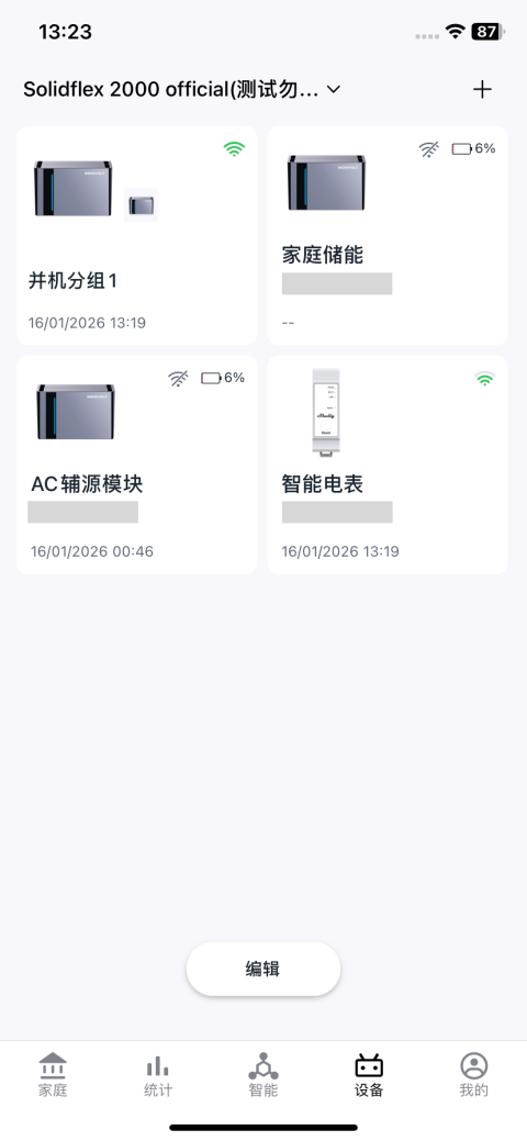 设备页面集中展示您家庭中所有的能源设备,并列出设备SN、在线状态及数据更新时间等关键信息。点击右上角 + 按钮,即可添加设备
