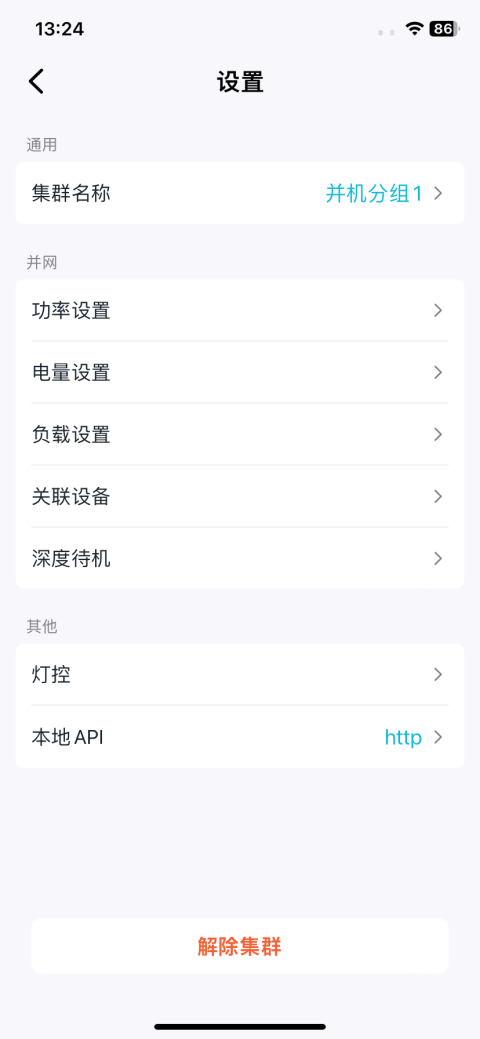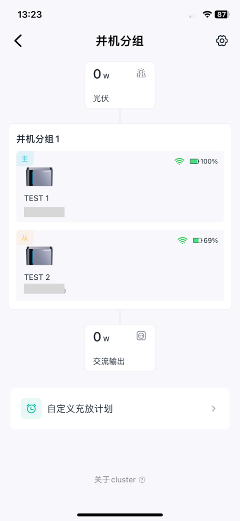 点击该并机分组卡片,即可进入集群详情页面,查看主从设备关系、集群的用能策略、实时功率数据。