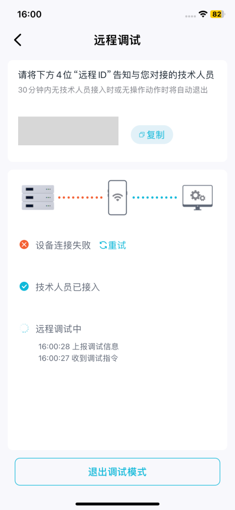 系统将自动生成一个远程调试ID。请将此ID提供给技术支持人员,以便其远程接入并进行诊断。