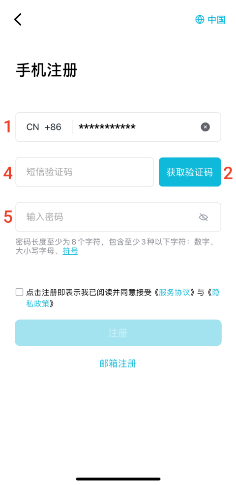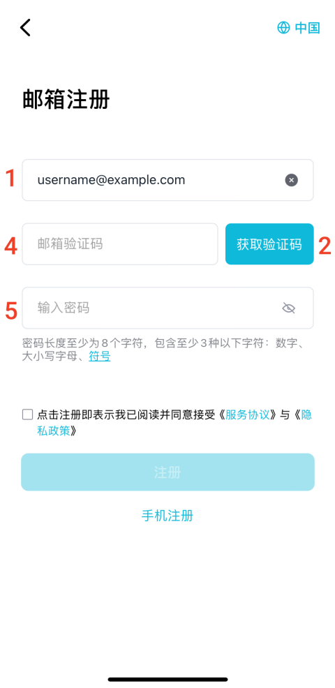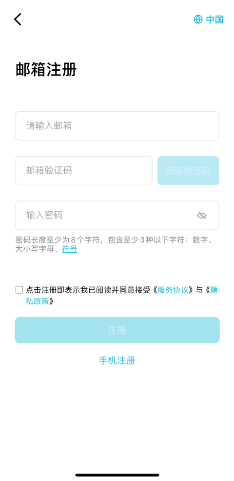系统默认提供邮箱注册,同时为中国大陆用户提供手机注册选项。